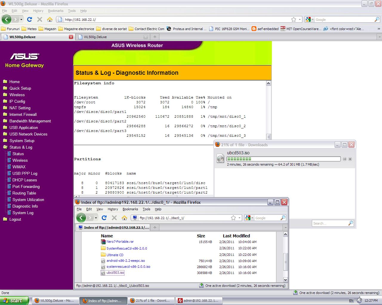 > Probabil unul dintre cele mai flexibile si ieftine routere este modelul WL-500g de la Asus. Singurul inconvenient intalnit pana acum, la acest model, este procesorul de doar 200Mhz, lucru ce limiteaza mult viteza de download/upload indiferent de distributia de linux si versiunea de kernel ce ruleaza pe el. Am incercat un overclock la 300Mhz dar viteza de transfer nu se imbunatateste considerabil, astfel routerul ramane util pentru aplicatii ceva mai “exotice” precum: server FTP/TFPT, print server, samba server, webcam